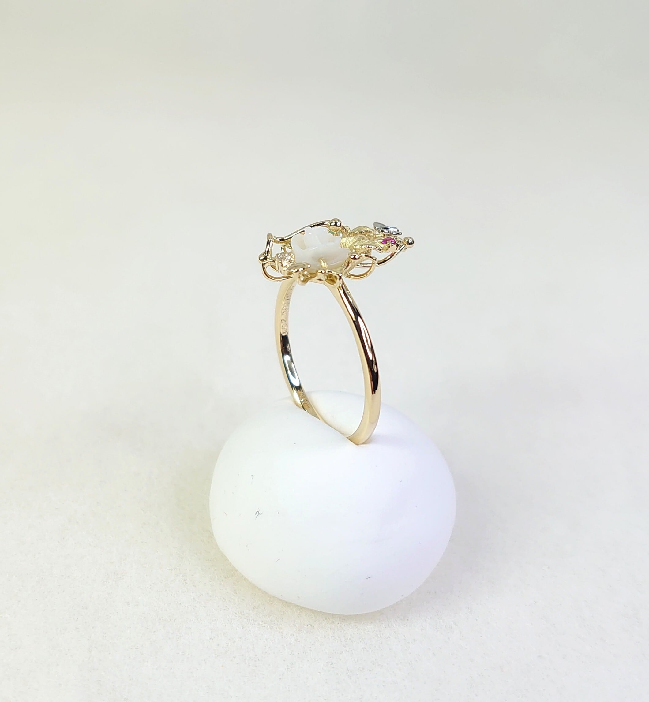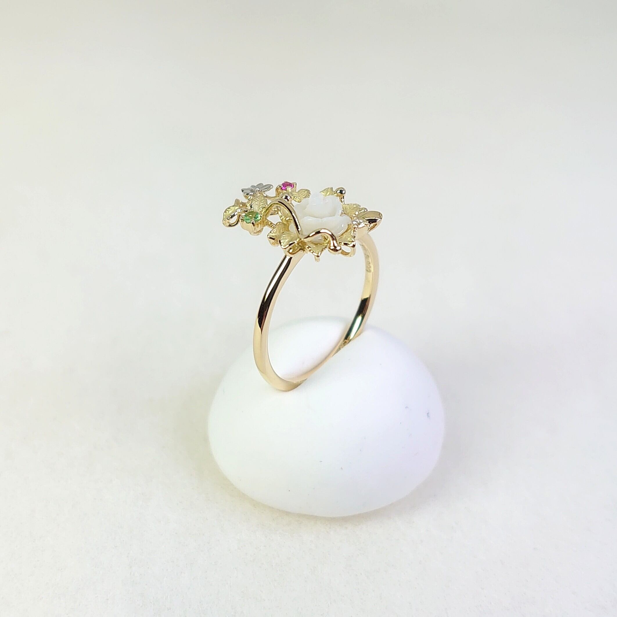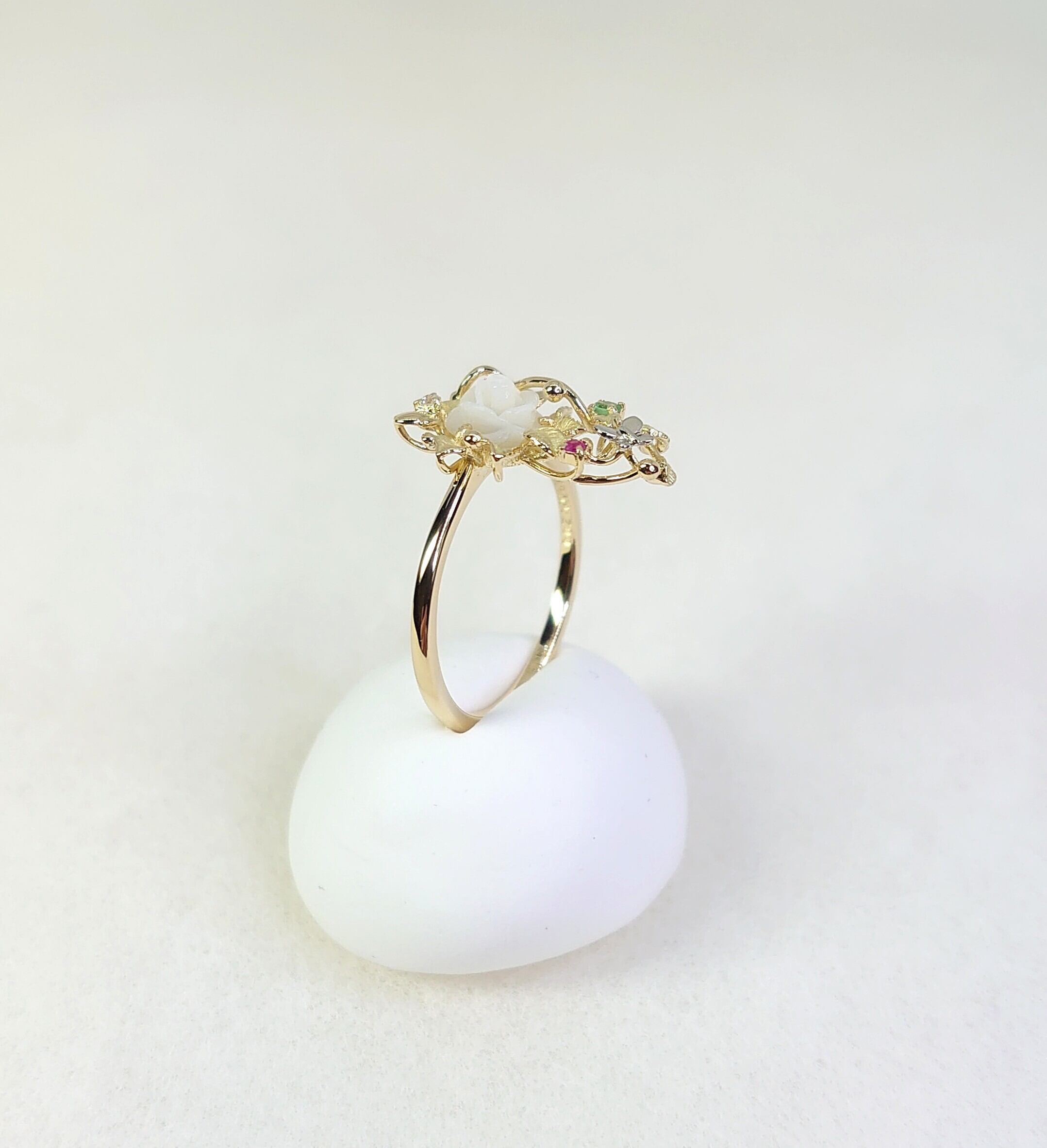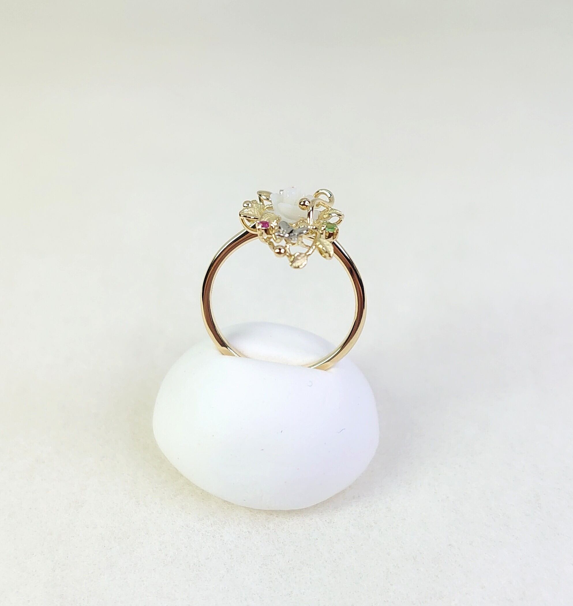 春の訪れを感じさせるデザインのK18白蝶貝・色石・ダイヤ入リングは、白蝶貝の花カービングが魅力的なアクセントとなり、絶妙に輝く色石やダイヤモンドとプラチナの蝶のデザインがさらに特別感を引き立てています。このリングは、日常のスタイルに花を添えるだけでなく、特別なシーンにもぴったりです。大切な方への贈り物としても、自分自身へのご褒美としてもおすすめの逸品です!