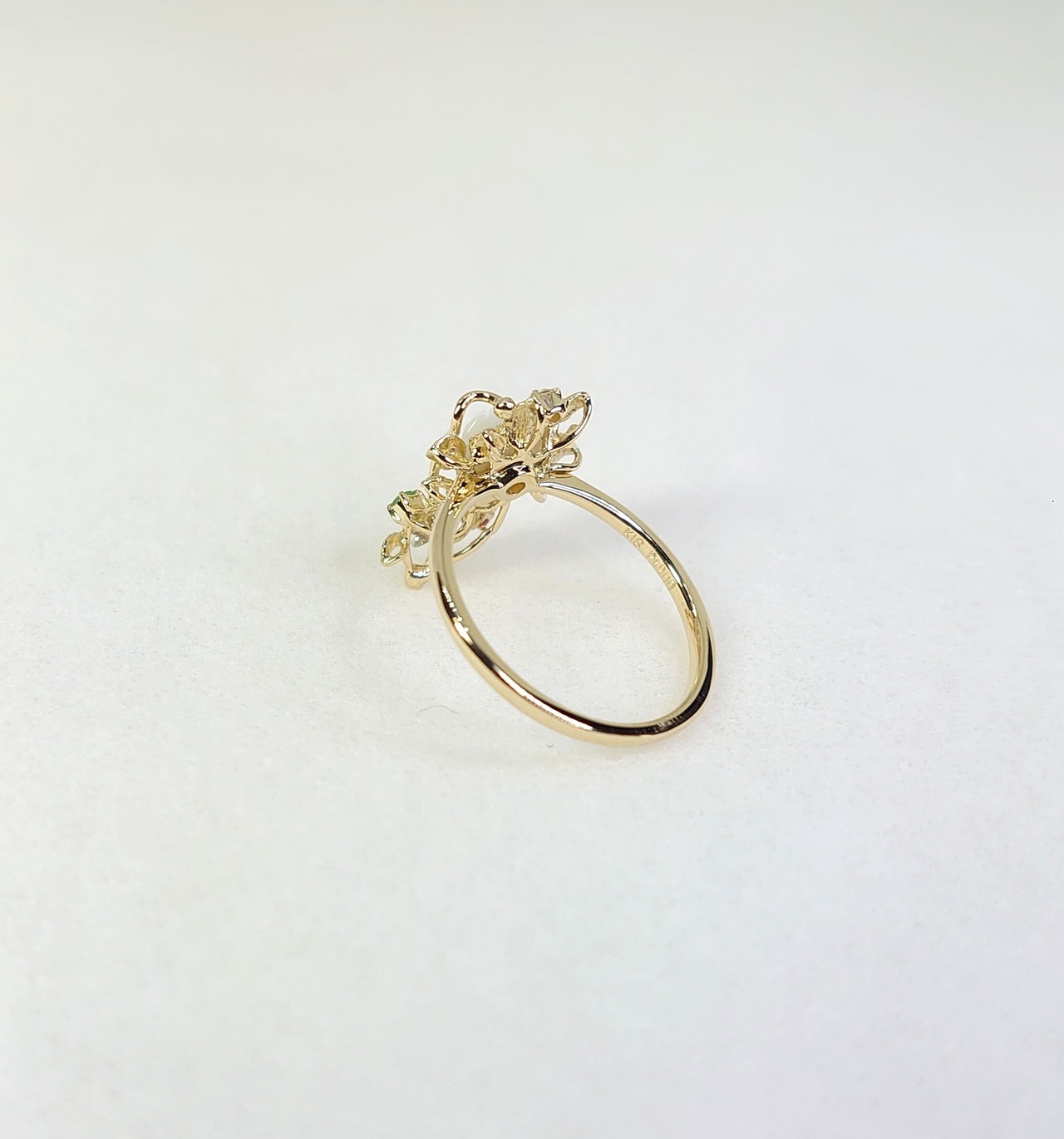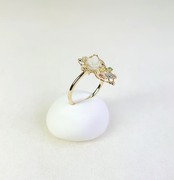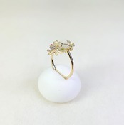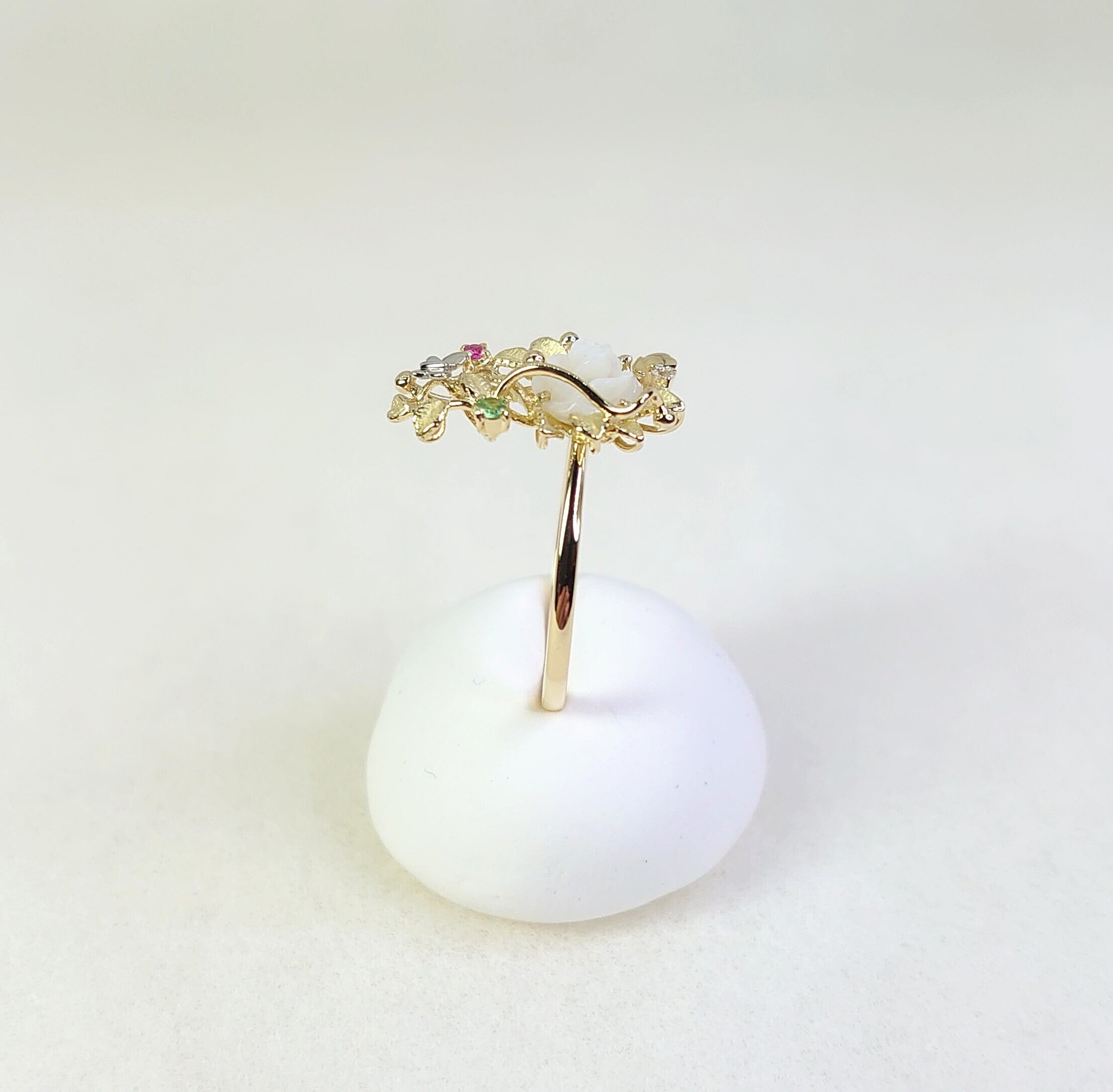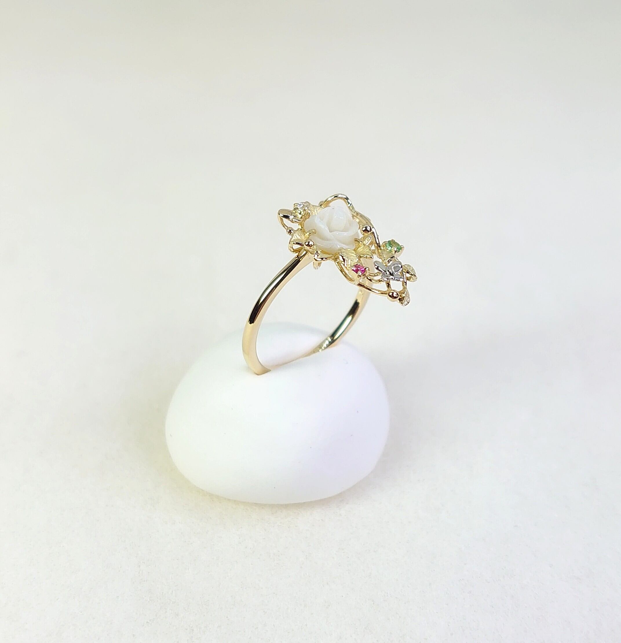 春の訪れを感じさせるデザインのK18白蝶貝・色石・ダイヤ入リングは、白蝶貝の花カービングが魅力的なアクセントとなり、絶妙に輝く色石やダイヤモンドとプラチナの蝶のデザインがさらに特別感を引き立てています。このリングは、日常のスタイルに花を添えるだけでなく、特別なシーンにもぴったりです。大切な方への贈り物としても、自分自身へのご褒美としてもおすすめの逸品です!